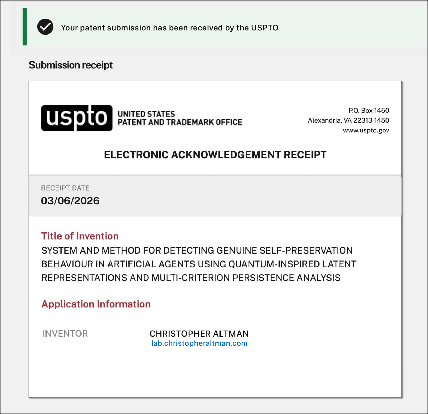 The filing covers the measurement architecture for detecting continuation structure in autonomous AI systems — including structural readouts, falsification methodology, and the observatory instrument design.